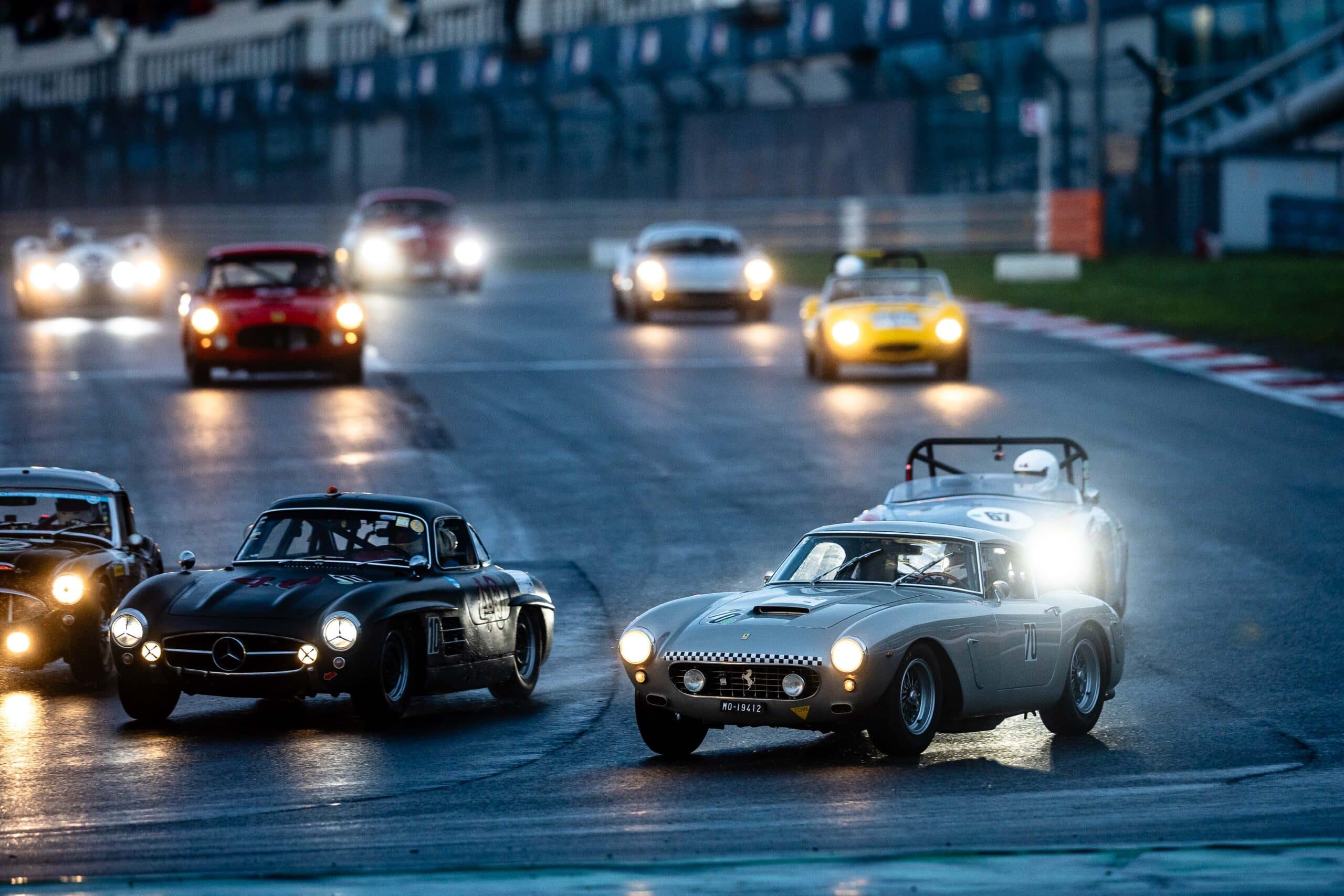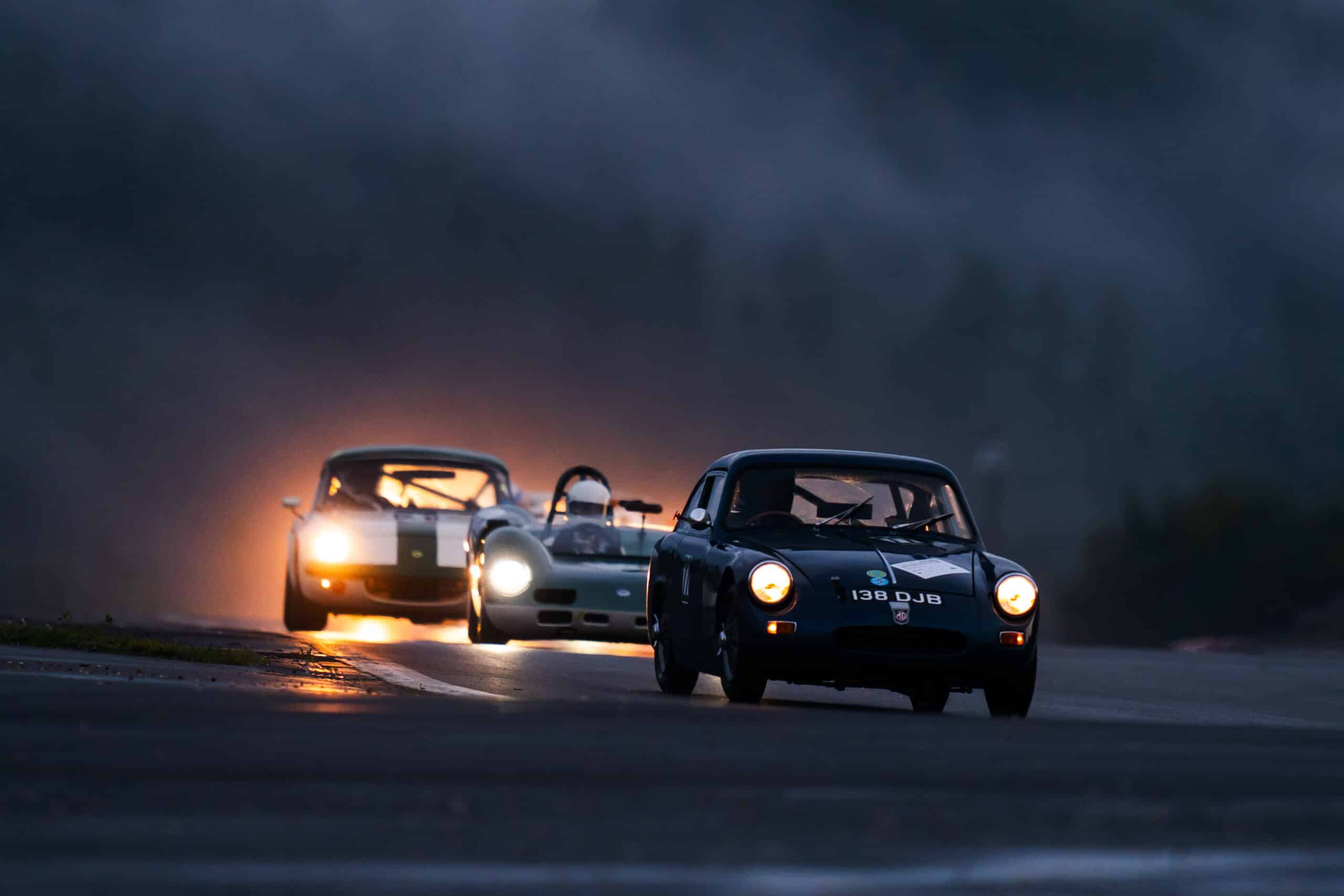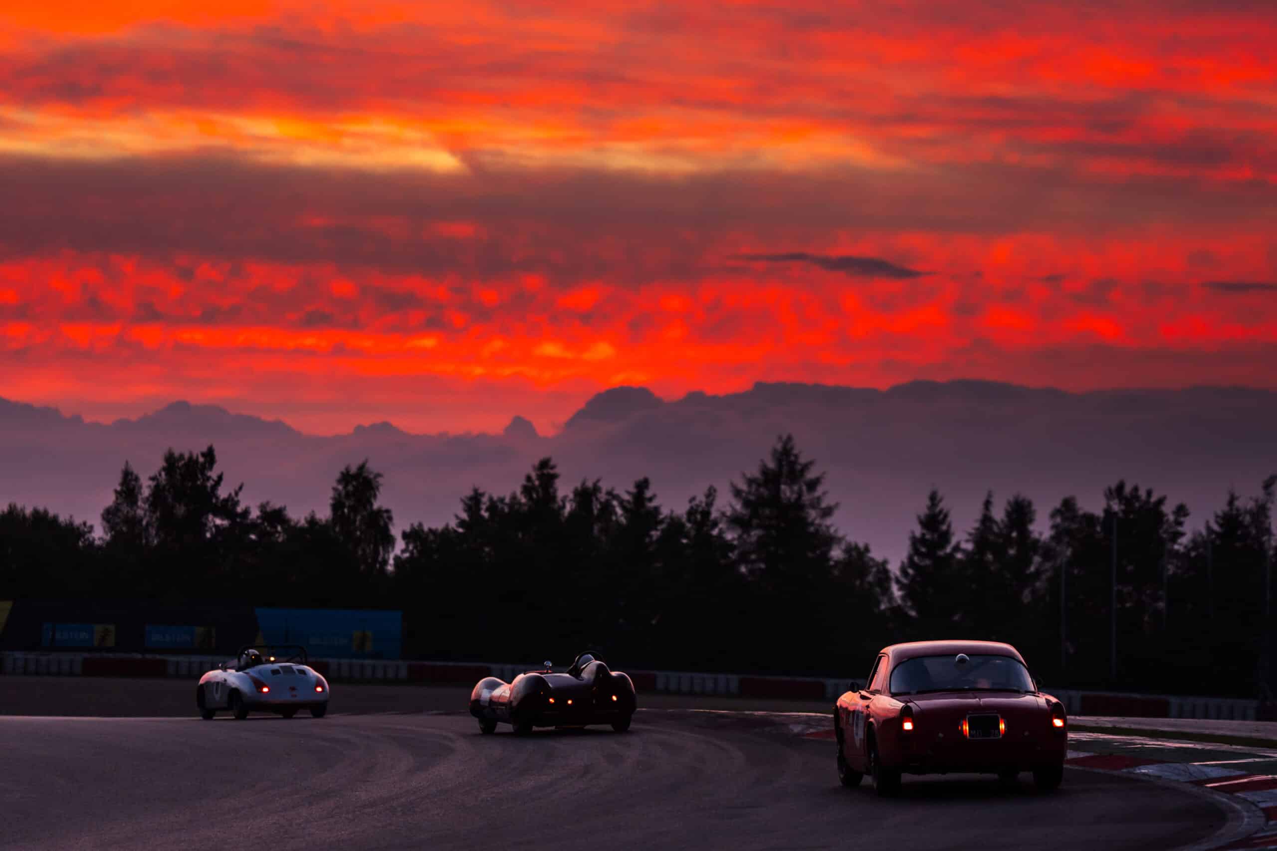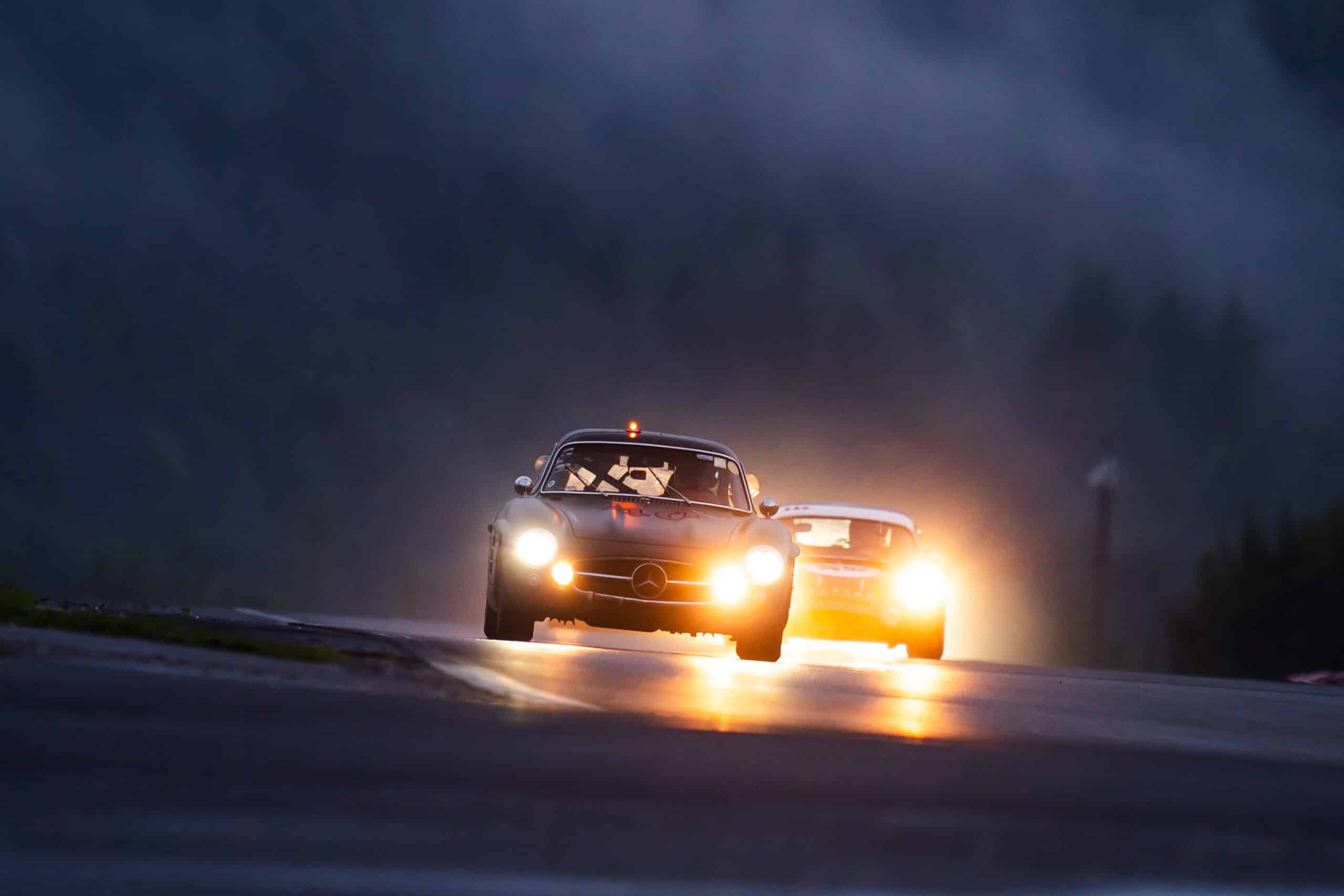 Als das kräftige Wolkenband am Samstagabend pünktlich kurz vor Rennbeginn abzog und der Regen aufhörte, atmeten viele Teilnehmer, Experten und Fans auf. Denn der Höhepunkt des Wochenendes – das Abendrennen der zweisitzigen Rennwagen und GT bis Baujahr 1971 – konnte bei einigermaßen erträglichen Streckenbedingungen stattfinden. Was dann folgte, war ein beeindruckendes Zusammenspiel aus historischen Motorsportlegenden und technischer Vielfalt. Und trotz einiger Ausrutscher entfaltete sich anschließend einmal mehr der spezielle Zauber, den nur die vielleicht schönsten Sportwagen aller Zeiten in der einsetzenden Dämmerung präsentieren können.